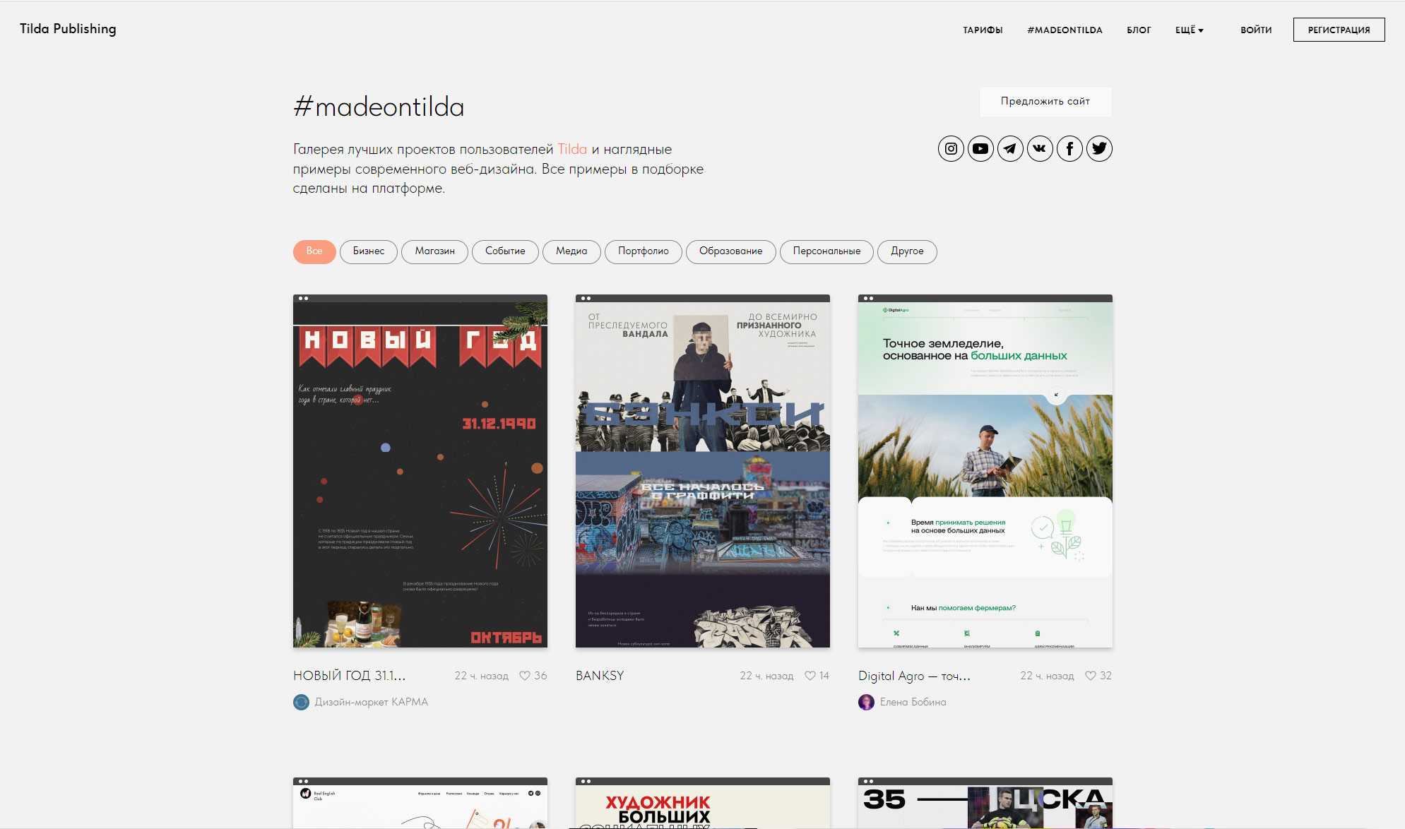 Tilda позволяет быстро создать небольшой сайт и даже интернет-магазин из готовых блоков. По этой же причине все сайты на Tilda, созданные недизайнерами, похожи друг на друга.